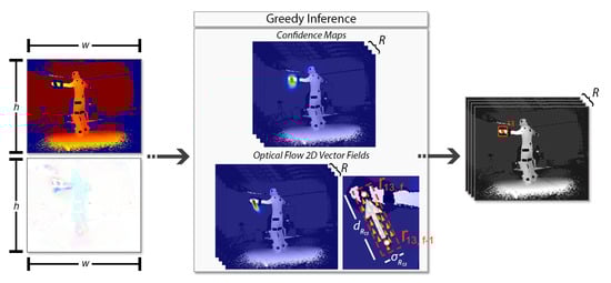 The overall FCN method is illustrated in Figure 5. A pair of images, the colorized depth and the corresponding 3D optical flow , are given as input. A FCN simultaneously predicts a set of 2D confidence maps of the reflector locations and a set of 2D vector fields ; the latter corresponds to the optical flow fields (OFFs) from the previous frame to the next one, encoding the temporal correlation between sequential frames. Both sets contain elements, one per reflector , the set , , where w and h are the width and height of the input images respectively, and the set , where . Finally, a greedy inference step is applied on the extracted confidence maps and OFFs, resulting in 2D reflector-set estimation.