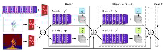 where the number of stages T is equal to 6, experimentally set by evaluating the results on the validation dataset for and stages, as proposed in [,], respectively. At the end of each stage, two loss functions, and , between the predictions and the ground truth are applied to guide the network branches to predict confidence maps and OFFs, respectively. At stage t, for a 2D location , , the loss functions are given by: