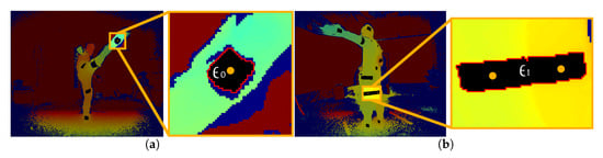 In Figure 7, two of the potential cases with respect to the reflector spatial mapping are shown. In the first case (Figure 7a), the simple and most common one, is the detected region for a reflector . Retrieving a pixel set of the region contour in (red pixels in Figure 7a), and mapping its points to , the corresponding raw depth values of are given. Using only the non-zero depth values of , the median value is considered the distance of the reflector from the sensor view v.