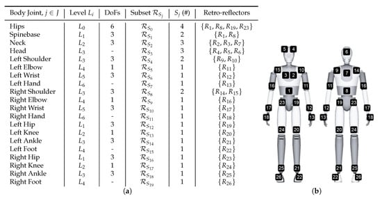 The proposed articulated body structure consists of 20 joints, , including DoFs. It contains , hierarchical joint levels and the bones of the structure are registered to particular reflectors. To this end, a reflector subset , moves the body joint according to the body joint hierarchy. The correspondence between the joints and the reflectors is depicted in Figure 9a, while the reflector-to-body part mapping is illustrated in Figure 9b.