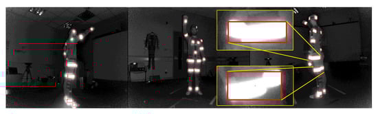 A second set comprising 2.5D data (DMC2.5D Dataset) was captured in order to train and test the proposed FCN. Using the recorded IR-D and MoCap data, colorized depth and 3D optical flow data pairs per view were created, as described in Section 3.2. The samples were randomly selected from 8 of the 10 subjects, excluding 2 of them to use them for the evaluation of the MoCap. More specifically, single-view pair samples were annotated with over total keypoints (i.e., reflector 2D locations of current and previous frames on the image), trying to cover a variety of poses and movements in the scene. , and samples were used for training, validation and testing the FCN model, respectively. The annotation was realized by applying image processing and 3D vision techniques on the IR-D and MoCap data. In particular, applying blob detection on the IR binary image yielded the 2D locations of the reflectors, while then, the corresponding 3D positions were estimated by applying 3D spatially mapping (Section 3.4.1). Finally, the reflectors were labeled by comparing the euclidean 3D distance per frame between the extracted 3D positions and the joint 3D positions of the ground truth data. However, the automatic labeling was erroneous in the cases that the reflector regions were merged (Figure 10) or the poses where complex. The complex pose issues occurred due to the positional offset between the reflector and the joint 3D positions, confusing the labeling process. Thus, further processing was required in order to manually refine the dataset.