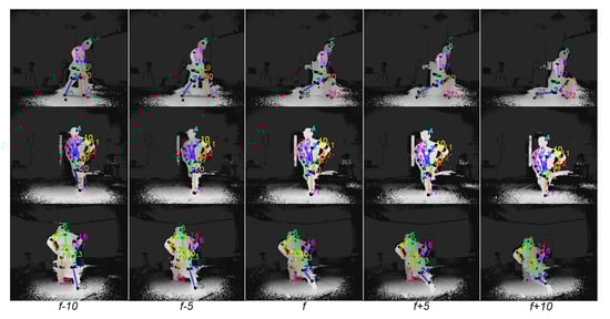 Visualization of the proposed FCN outcome overlayed on sequential multi-view depth frames. Five multi-view sequential frames, from frame to with frame step equal to 5, are horizontally presented.