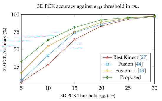 In the plot presented in Figure 14, the total 3D PCK accuracy is given against threshold values. DeepMoCap shows higher efficiency for all , showing high 3D PCK accuracy from low threshold values (e.g., and for cm and cm, respectively), in comparison with the next best method that presents and , respectively. Given the fact that joint positioning varies between different motion capture approaches resulting in the existence of a positional offset between the estimated 3D joint positions, we conclude that DeepMoCap shows high efficiency by presenting of the estimates on average to be closer than 5 cm from ground truth.