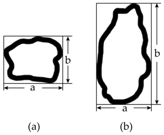 The method that was used for equivalent particle size determination in our previous research was mechanical fine sieving, which is the most commonly used method for raw material processing and sorting. The scraps to be tested with impact were sieved into several fractions by using screens with different sieve mesh sizes by employing manual or mechanical vibration devices. The process is characterized by simple screening equipment and easy operation, so it is a common application. However, plastic scraps with random shapes are generated through the shredding process and several irregular scraps are inevitably produced. A diagram of two representative scraps are illustrated in Figure 1. The width a and length b of scrap (a) are basically the same, while the dimensions of scrap (b) differ greatly, which means that the shape of scrap (a) is much more regular than (b). If the length-to-width ratio of a scrap, i.e., the value b divided by a, is larger than 1.68, the scrap is considered to possess an irregular shape [23]. The sieving method is effective for the measurement of scrap (a), with appropriate deviations, but for scraps with high irregularity, such as (b) illustrates, the deviations from using mechanical sieving could be very high. If irregular scraps like (b) are produced in high proportions, then this mechanical sieving method will become impractical, as the majority of the measurements are likely to be deviations.