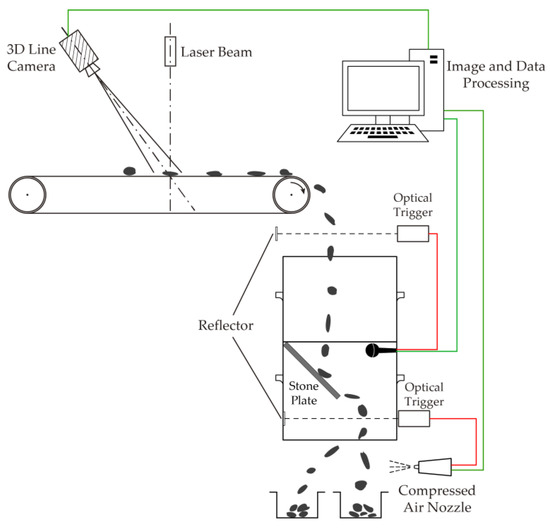 The installation of the whole experimental system, which is shown in Figure 3, includes the laser triangulation system and impact acoustics acquisition instrumentation. In this experiment, scraps were dropped from a conveyor to impact a stone plate, and an acoustic pickup was used to acquire the impact acoustics, which were then transferred to a computer. The laser triangulation system comprises a laser beam and a 3D line camera, which is used for the thickness measurement through image acquisition. Modern 3D line camera products have the ability to measure 3D visual parameters, positions, and morphological characteristics of objects synchronously. Its line rates are high, reaching 47,000 lines/s, and the resolution of the acquired image is 4096 × 8560 pixels. Finally, all the data were compiled in a computer for processing and analysis, and then a compressed air nozzle was controlled to sort the samples. This mechanism was introduced in detail in our previous studies [18,19].