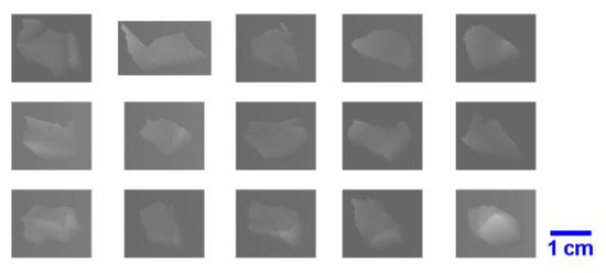 The aim of image processing is to detect, locate, and segment the scrap images by border line recognition of each scrap image. By using a 3D line scan camera, scraps were imaged in grayscale; some examples are shown in Figure 4. In this research, all of the image processing and measurement works were performed automatically through programming while using MATLAB.