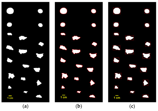 For the acquisition of scraps’ border lines, edge detection processing was used. Determination of border lines from a binary image is a standard problem in edge detection, and various methods have been proposed [33]. The Canny edge detector is an operator that uses a multistage algorithm to detect edges, and it is widely used due to its robustness to various conditions [34]. Subsequently, the extracted boundary lines were superimposed over the binary image, as shown in Figure 5b.