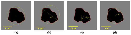 The Form Factor (FF) was first described as “percentage roundness” [35], which is defined by the American Society for Testing and Materials (ASTM). It is the most commonly used method and it can be described as the ratio of the object area to the area of a circle with the same perimeter, but it is usually calculated by using the perimeter itself, which is shown in Equation (9) [35]. The diagram in Figure 6a illustrates the basic principle of this method.