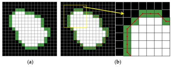 The perimeters are computed by calculating the distance between each adjoining pair of pixels around the border of the object. The green pixels in Figure 7a illustrate the border pixels included in the perimeter calculation for this object. The border line thus obtained is a combination of lines between the centers of two adjacent border pixels, as the red line shows in Figure 7b. The perimeter is calculated according to the following equation [38]: