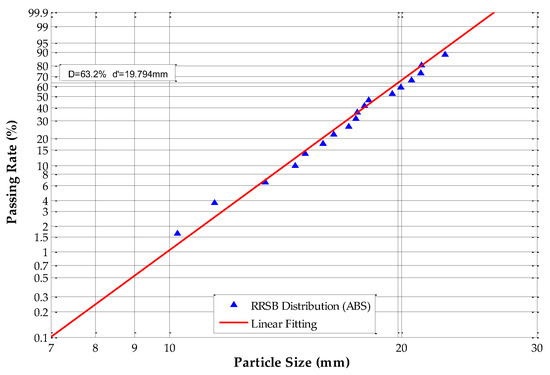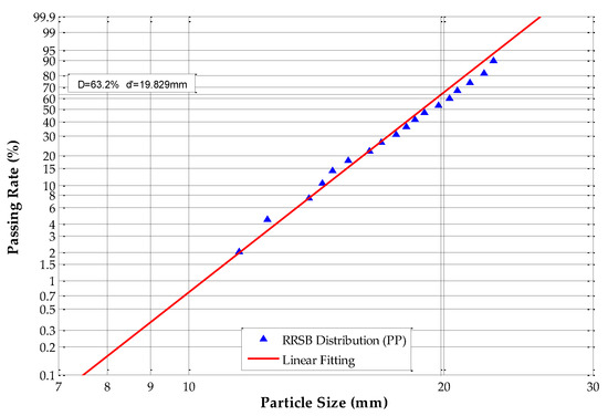 The equivalent particle sizes were analyzed and calculated according to Equations (10) and (17); in this paper, k is equal to 0.305. The Rosin–Rammler–Sperling–Bennet (RRSB) size distribution and fitting analysis results are shown in Figure 8, Figure 9, Figure 10 and Figure 11.