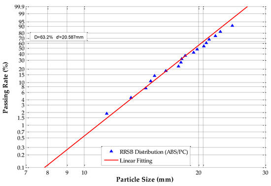 In the sieving analysis, the masses of crushed scraps passing through each screen are expressed as the percentages of the total weight of sample. The interpretation of scraped samples of plastic materials generated from high speed impacts in shredder, spallation, and fragmentation process occur randomly. Many distribution models have been proposed to determine the homogeneity of the particle-size distribution (PSD) of crushed scraps [28,29]. One of the most important method is the Rosin–Rammler–Sperling–Bennet (RRSB) distribution, which is also called the Weibull distribution [30,31], which is usually used for describing the characteristics of the cumulative distribution of scrap sieving fractions.