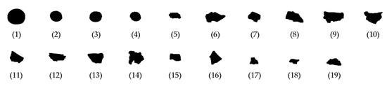 According to the verified regularity of tested polymers scraps, the above-mentioned circularity measurement algorithms were implemented using MATLAB. The objects in the processed images were identified and their circularities were measured. The results of all the circularity determination methods are within the range (0, 1], and a value is equal to 1 if, and only if, the measured object is a perfect circle. Some tested plastic scraps are shown in Figure 12 as examples, and the circularity calculation results of the four above-mentioned methods are shown in Figure 13. In addition to the tested samples, we added four nearly circular scraps as references, which are the scraps numbered 1–4 in Figure 12.