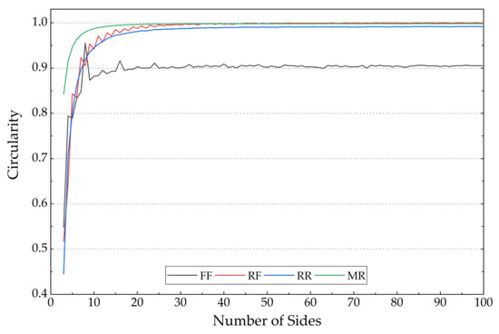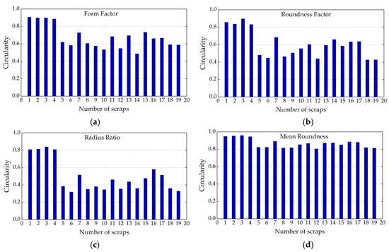 For a regularity analysis of the tested scraps, a simulated polygon method was programmed and tested on polygons with sides ranging from 3 to 100. The results are shown in Figure 15, where it can be seen that as the number of sides’ increases, the circularity approaches 1.0 correspondingly. However, as opposed to the other three methods, the Form Factor method (FF) only reaches 0.9, which has been verified as unreliable for quasi-circular objects.