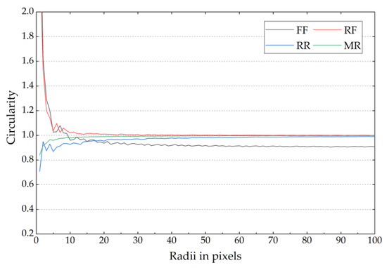 In order to analyze the precision of the four methods in this research, perfect circles were artificially programmed with varying radii, ranging from 1 to 100 (in pixels), and tested. The results are shown in Figure 14. As can be seen from the figure, the Form Factor and Roundness Factor methods do not satisfy the basic requirement that the calculated circularity must have a range of (0,1]. In other words, the Form Factor and Roundness Factor are more sensitive to resolution than the other two methods.