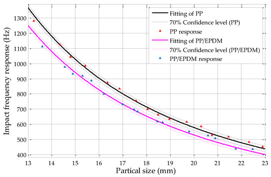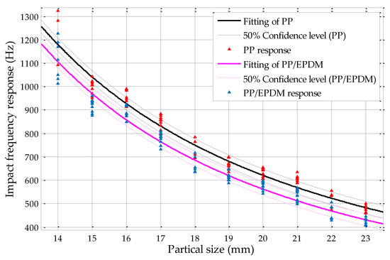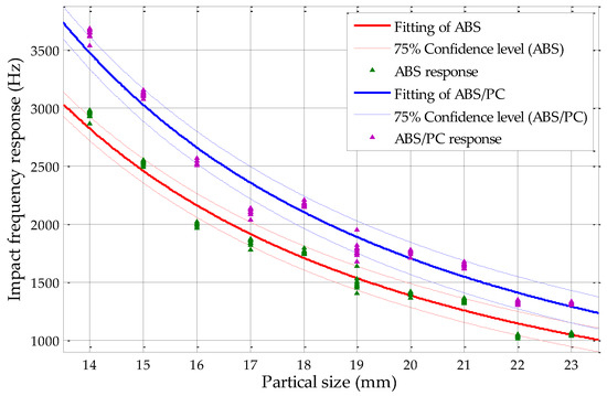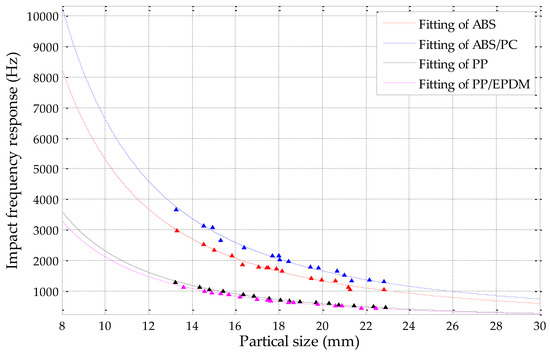 After the determination of equivalent particle size, a fitting analysis of the impact frequency response for the four kinds of scraps was implemented by using the mechanism demonstrated in Equation (7), as well as our previous studies. The analysis used scraps with a particle size greater than 13 mm (not inclusive) and smaller than 23 mm, as particles with sizes that are in this range can generate acoustic signals with adequate intensity. The fitting results of ABS, ABS/PC, PP, and PP/EPDM are shown in Figure 16.