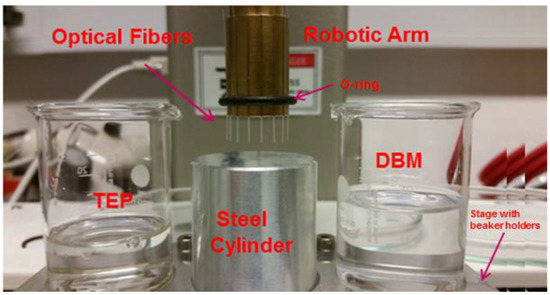In each groove, a fiber of 35 mm length was placed and fixed with the help of an O-ring. The advantage of using an O-ring fixture, is that it allows sliding the fibers inside the grooves to adjust their vertical position. The fiber holder was attached to the robotic arm, which moved in the z-direction to immerse the fibers into the solvents for etching. Another part of the setup consisted of a stage with three beaker holders. Two were used to hold the beakers with solvents used to etch and remove the core and the cladding. The middle holder was used for a steel cylinder, which has a smooth surface. The purpose of this steel cylinder was to adjust the vertical position of all the fibers against the smooth surface to avoid any variation in the final CPC tip lengths after etching. Once all the fibers were adjusted to the same level, the robotic arm was programmed to immerse them in the solvents for etching.