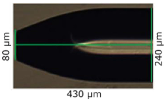 The formation of the CPC fiber tip has 3 main steps: (1) Etching of the fiber core, (2) removal of the fiber cladding from the CPC tip, and (3) cleaning of the fiber tips. Without removing the cladding, fibers were immersed into the beaker containing 99% dibromomethane (DBM) from Sigma-Aldrich Denmark A/S (Copenhagen, Denmark), a solvent for etching the PMMA fiber core without etching the PVDF cladding. The immersion depth of the fibers was controlled using the robotic arm to be around 700 µm. The fibers were then left for etching for about 15 min. in dibromomethane (DBM). After 15 min, the fibers were removed from the DBM, cleaned first with dry lint free tissue and then with a tissue with distilled water and immersed in 99.8% triethylphosphate (TEP) from Sigma-Aldrich Denmark A/S (Copenhagen, Denmark), a solvent for etching the PVDF [34] cladding without etching the PMMA core, for 5 min to remove the cladding. In the next step, the fibers were removed from the TEP solution and cleaned with distilled water to remove any residual solvents. A CPC formed by this method, is shown in Figure 2. It had a length of 430 µm and an output diameter of 80 µm, which is very close to the ideal CPC specifications.