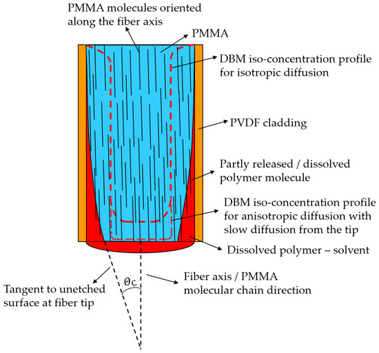 - The concentration profile of anisotropically in-diffused solvent at the fiber tip region. From the fiber drawing polymer molecules are oriented along the fiber axis [36] leading to crystallinity. Diffusion cannot be expected to be isotropic in an anisotropic polymer material [37,38,39]. Thus, it could be that DBM diffusion from the fiber tip along the fiber axis-oriented molecules is much slower than perpendicular to the molecular chain direction. This provides a good explanation for both the almost constant fiber length and the sharp edge maintained at the fiber tip at all etch times.