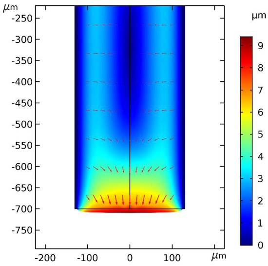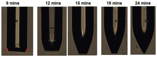 Strong anisotropic removal of PMMA was evidenced in two ways. First, retraction of the core tip from the original cut plane could not be seen as depicted in Figure 3. However, such fiber tip retraction is observed in glass fiber etch inside HF permeable polymer tubes, indicating more isotropic glass removal [26]. Secondly, it was confirmed by immersing a 1 mm thick declad PMMA core fiber in DBM and observing the thickness and length changes. COMSOL Multiphysics simulations, see Figure 4, show that alone 1, 3, and 4 from above, i.e., anisotropic DBM diffusion into the PMMA fiber core from the tip and through the semi-permeable PVDF cladding and the induced PMMA swelling displacement field, can account for much of the observed shaping. Thus, the displacement field in Figure 4 shows that PMMA was locally moved inward and downward by swelling. In sufficiently swollen regions, this movement may loosen the PMMA along the arrow directions and in this way control the etch/dissolution leading to the CPC shape. Note that, at a distance of approximately 400 µm from the tip, the movement was, at all times, only small and inward, which corresponds well with the observed CPC length, see Figure 2. This demonstrates insensitivity of CPC length on dipping depth beyond approximately 400 µm and buoyancy of dissolved material. Figure 5 shows fiber tip shapes obtained after different times and after removal of the cladding to make the shape more visible. The central picture after 15 min is the best CPC shape also shown in Figure 2. From the pictures, has been found to be approximately 23° for the first four etch times from the left. After 24 min etch there was no longer a plane-cut surface at the fiber tip and now at the fiber tip had changed to approximately 30°.