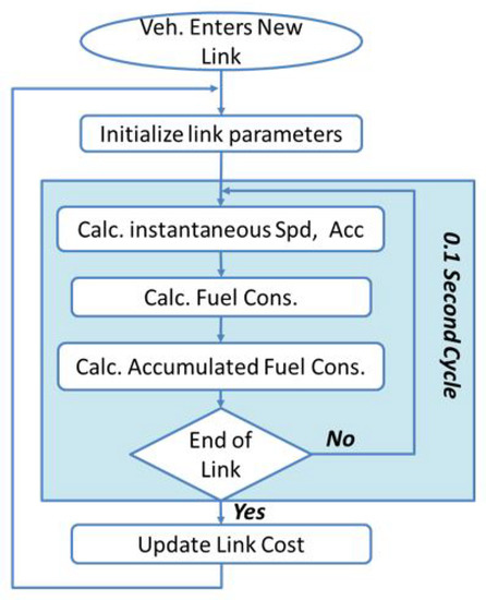 In the INTEGRATION framework, eco-routing is developed as a feedback system that assumes the vehicles are connected and equipped with GPSs. Moreover, a vehicle is assumed to be capable of calculating the fuel consumption for each road link it traverses and communicating this information to the TMC. In INTEGRATION, the fuel consumption and emission rates of each vehicle are calculated every second, based on instantaneous speed and acceleration. As shown in Figure 1, every deci-second, the speed and the acceleration of each vehicle are calculated, as well as the vehicle’s fuel consumption rate.
