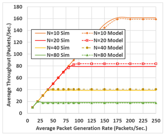The model shown an accurate estimation of both packet drop probability and packet delay at different communication settings, including different packet sizes and different packet generation rates. An example of the model validation results is shown in Figure 3 and Figure 4. These two figures compare the model output to the simulation output, resulting from the OPNET software [20] (which is a powerful communication networks simulation tool).