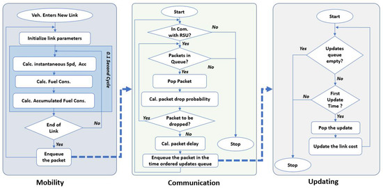 In this paper, to model the communication we assume V2I communication setup. The communication model, described in the previous subsection, is implemented within the INTEGRATION software, and the behavior of the eco-routing is modified to adapt the communication parameters (packet drop probability and packet delay), as illustrated in Figure 5, which shows three modules working in parallel; mobility module that moves the vehicles, a communication module that computes the packet drop probability and delay, and an updating module which updates the link cost information. The two later modules (communication and updating modules) are two new modules we added, to the capture the impact of communication on eco-routing. The three modules work together as follows: