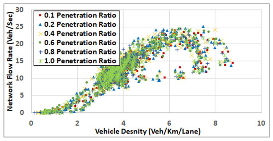 Figure 8 and Figure 9 show that, at low traffic demand levels, the impact of the penetration rate is not significant. Meanwhile, Figure 11 shows the network fundamental diagram for ODSF = 0.8, where a penetration rate of 0.1 shows relatively high vehicles density combined with low traffic flow, which reflects temporary network gridlocks, that can be explained by the lack of routing information at a 0.1 penetration rate, which produces inaccurate routing decisions. The figure also shows that, for the higher penetration rates, starting at 0.2, the gridlocks do not exist. These gridlocks at the low penetration rate is reflected in the higher fuel consumption rates in Figure 7. This also supports our conclusion that 20% penetration rate is enough to deploy the FB-ECO systems and achieve acceptable performance.