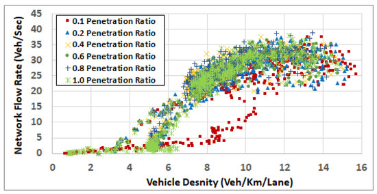Figure 12 shows that, at high traffic demand level (full demand rates), the impact of the penetration rate on network congestion becomes more significant. It shows that at a 0.1 penetration ratio, the network congestion becomes higher and the overall network enters the congested regime. It also shows that increasing the penetration ratio results in better system performance. It also shows that the overall network behaves the best at a penetration ratio of 0.6 or 0.8.