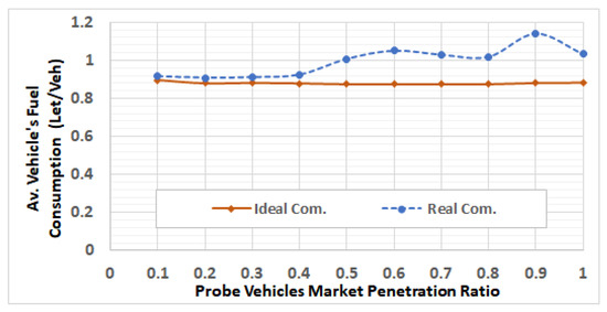 The results also demonstrate that, at high traffic demand levels, the average vehicle’s fuel consumption is significantly higher in the realistic communication cases, compared to the ideal communication cases at all the penetration ratios, as shown in Figure 18.