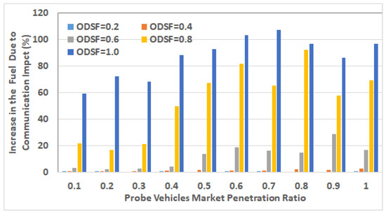 Figure 18 shows the percentage of increase in average fuel consumption per vehicle due to realistic communication modeling in all of the 50 scenarios. This percentage is computed as , where and are the average fuel consumption in the realistic communication case and the ideal communication case, respectively. It can be easily concluded that the impact of communication is exponentially increasing with the vehicle traffic demand level at all the penetration ratios. It also shows that the percentage of fuel increases at ODSF equal to 0.8 and 1.0, and decreases in some cases (i.e., for penetration ratios 0.5 and above) because of the vehicles that become stuck in the network due to the grid-lock problem, which makes the fuel computation not accurate in these cases, as above.