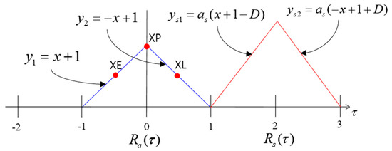 In the receiver, a correlation process is implemented to track the input signal . Figure 2 shows the ACF model of . The blue triangle indicates the ACF of the authentic signal, whereas the red triangle indicates the ACF of the spoofing signal. The horizontal axis represents the chip offset, and the vertical axis represents the normalized correlator output (the amplitude of the authentic signal is 1). The parameters, shown in Figure 2, can be expressed as follows: