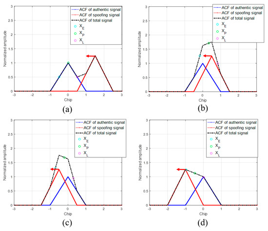 ACF variation with respect to the difference in the code phases between the authentic and spoofing signals. (a) D = 1.5; (b) D = 0.5; (c) D = −0.5; (d) D = −1.