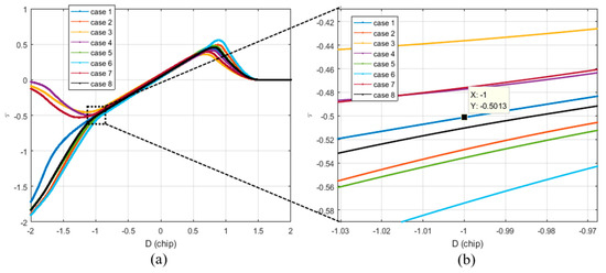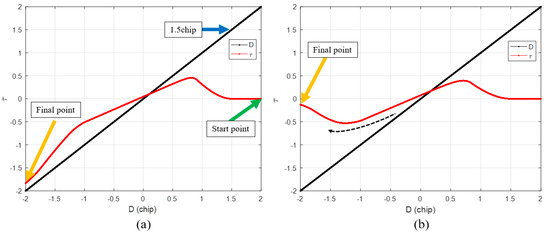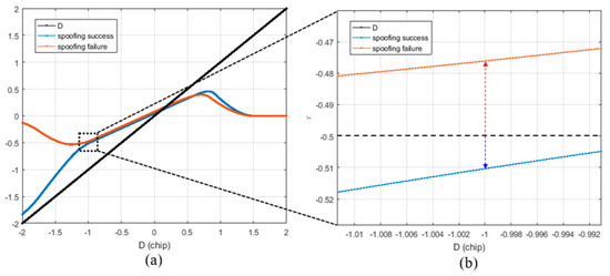 Figure 7a shows the estimates for various spoofing parameters listed in Table 3. It is noteworthy that the absolute value of at D is −1. As shown in Figure 7b, if the absolute value of exceeds 0.5 chip when D is −1, the DLL tracks the spoofing signal.
