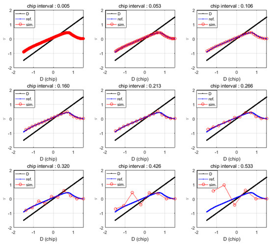 Assuming that the spoofing signal shifts from right to left, the spoofing signal affects the DLL discriminator when D approaches within 1.5 chip. Moreover, to determine the spoofing results, we only need to calculate until D reaches −1. Therefore, if CI is 0.125 chip, it is possible to determine the spoofing attack results by a total of 19 calculations. In Equation (4), all the previous τ values and ACF are required to calculate . The SPE can be used to calculate τ at the point where D is −1 to determine whether the spoofing attack is a successful one or not by only one calculation. When setting the CI to 0.125, the ACF variation could be known. However, it is not possible to specify the previous τ values. This is because τ value at a certain D changes according to the spoofing parameters. However, the range of τ can be defined for each D value for τ to be close to −0.5 chip when D is −1. The spoofing attack results can be determined by checking whether the absolute value of τ at D = −1 exceeds 0.5 chip or not. In our case, τ[19] is the final τ value. For τ[19] to be close to −0.5, τ[18] must be in a specific range. Moreover, τ[17] must be in a specific range for τ[18] to be in the defined range. Thus, we can define each range according to the D value of the entire process. Table 4 lists the range of τ[i] for each D[i] where i denotes each CI index. There are ACF models of XE and XL for each D. If each τ[i] is within the defined range for each D[i], τ[19] will be calculated close to −0.5. The details of the SPE derivation are given in appendix A. Finally, SPE has the following form like: