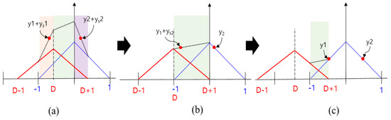 Figure 9 shows the summary of Equations (8) to (10). For any ACF, shown in Figure 8, can be estimated using and D when the spoofing sweep velocity is very low or when the bandwidth is considerable. Moreover, it is possible to calculate D corresponding to the different equations of Figure 10 shows the ACF change with respect to the spoofing signal when the spoofing signal strength is lower than the authentic signal strength. We can derive an equation to calculate in the same manner as above. The value for the cases, shown in Figure 10a,b,c can be derived as follows: