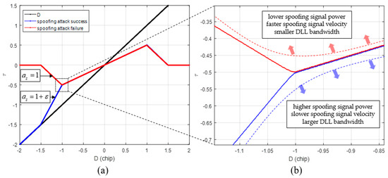 Figure 11 shows the summary of Equations (11) to (13). Figure 12 shows a graphical representation of Equations (8) to (13). The blue lines indicate spoofing attack success, whereas the red lines indicate spoofing attack failure. If is greater than 1, follows the blue line, and if is lower than 1, it follows the red line. When is 1, D at the time of transition, from (b) to (c) in Figure 8, is −1, and the absolute value of becomes 0.5. In case that the spoofing sweep velocity is infinitely slow or the DLL bandwidth is infinitely large, the condition for a successful spoofing attack is that the power of the spoofing signal sets in greater than that of the authentic signal. If the spoofing signal power is a little greater than the authentic signal power, the replica code phase is lower than −0.5 at D is −1. If the spoofing signal power is a little smaller than the authentic signal power, the replica code phase is higher than −0.5 at D is −1. Thus, we could regard that the value is a boundary value when D is −1. This implies that the absolute value of should exceed 0.5 chip before D approaches −1 for a successful spoofing attack. Figure 13a shows the histories with respect the spoofing signal power. indicates a very small positive value. Slope of each line is differently changed after D exceeds −1. Figure 13b shows the value change with respect the spoofing parameters in the real scenario.