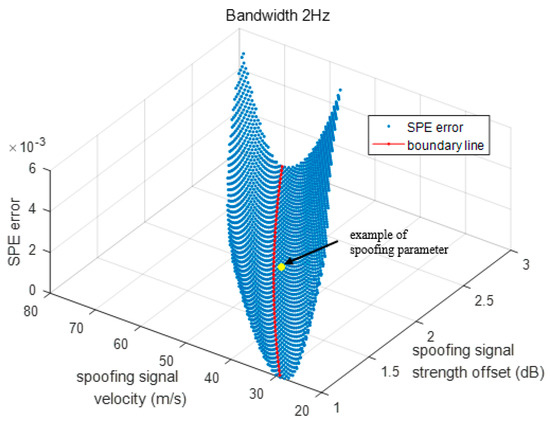 The boundary line and surface that divide the spoofing attack success and failure can be estimated using the SPE. The input parameters of the SPE are the spoofing signal strength, spoofing signal sweep velocity, and DLL bandwidth. In Equation (15), if we set each variable as follows: