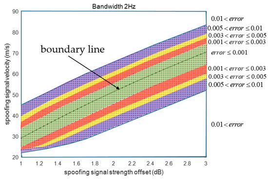 where is the function of the boundary line for the DLL bandwidth of 2 Hz. , , , and are the coefficients at the boundary line. Moreover, this line expresses the correlation between two parameters for a successful spoofing attack. From Equation (16), we find that as the spoofing signal strength increases, the spoofing attack becomes successful even with a higher sweep velocity.