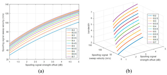 The spoofing attack success and failure zone is divided based on the boundary line, as shown in Figure 17b. The zone above the boundary line indicates spoofing attack failure, whereas the zone below indicates spoofing attack success. Figure 18a shows the boundary lines for various DLL bandwidths. We find that the receiver becomes more vulnerable to spoofing attacks as its DLL bandwidth increases. With the increase in the DLL bandwidth, the spoofing attack becomes successful even for a low spoofing signal strength when using a fixed spoofing sweep velocity. Figure 18b shows the boundary lines in three dimensions.