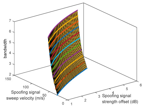 Figure 15 shows the error distribution of the SPE with respect to the spoofing signal strength and sweep velocity on a fixed bandwidth. At the yellow point, the values of the spoofing parameters, namely the signal strength offset, sweep velocity, and bandwidth, are 2 dB, 50 m/s, and 2 Hz, respectively. When is calculated for the above set of spoofing parameter values using the SPE, the error in is the Z axis value corresponding to the yellow point. The SPE performance is the best around the boundary line. The success and failure of the spoofing attack can be divided based on the boundary line.