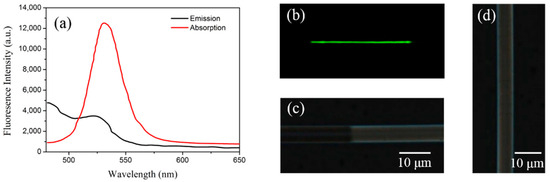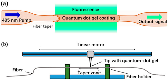 The microfiber was made from a standard SMF (SMF-28, Corning, Corning, NY, USA) by using a conventional flame-heated taper-drawing technique. The overall taper region was approximately 20 mm and the diameter of the microfiber was approximately 6 μm. The UV glue (NOA 61)-based CdSe/ZnS QDs with a concentration of 1 mg/mL were prepared by Mesolight, Suzhou, China (http://www.mesolight.cc/CdSexZnSxliangzidian.html). The photoluminescence and absorption spectra of the QD gel was tested and the fluorescence emission was at a center wavelength of 530 nm, as is shown in Figure 2a, with quantum efficiency of 80%. The QD gel was coated onto the taper zone of the fiber, using the coating system developed for this study, as is illustrated in Figure 1b. The fiber under coating was first fixed parallel to the linear motor. The tip of the needle with a drop of QD gel then precisely touched the fiber with the help of a microscope. By controlling the moving speed and distance of the linear motor, a uniform and desired coating task was achieved. During our experiment, the coating velocity was set as 0.2 mm/s, and the coating region was approximately 20 mm. After the coating, the QD film was cured by way of UV exposure for approximately 20 min.