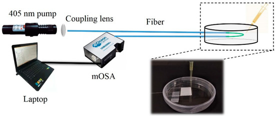 The schematic diagram of the test system is shown in Figure 3. For the spectral test, a 405 nm pump from a laser diode (LD) with a power of 30 MW was launched into the leading fiber as a pump source and the QD fluorescence spectrum was recorded using a micro-optical spectrum analyzer (mOSA, Ocean Optics STS-VIS, Largo, FL, USA) with a resolution of 0.53 nm. The dark field image of the fabricated sensor was first captured. As is shown in Figure 2b, one can see that a uniform green emission light was excited along the coating region. The microscopy images of the typical fabricated sensor are also given in Figure 2c,d. In Figure 2c, the coated (right side) and uncoated (left side) regions are clearly distinguished, and the boundary is also clearly visible. The diameters of the coated and uncoated regions were approximately 7.1 μm and 6.5 μm, respectively, which means that the coating thickness was approximately 0.6 μm. Figure 2d presents the coated region, which shows a smooth coating surface. Overall, the characterization of our fabricated sample confirms a good coating process.