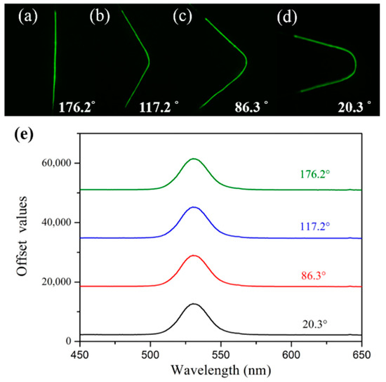 In the subsequent sensing performance experiment, and considering the operation convenience and compact sensor size, we fixed the sensor on a quart slide in a U-shape (see Figure 3). Thus, the bending test was carried out to investigate how the bending factor affected the fluorescence spectrum. The fluorescence spectra under four different bending angles of 176.2°, 117.2°, 86.3°, and 20.3° were recorded, and the dark field images of the corresponding bended sensor were also captured, as is shown in Figure 4. Compared with Figure 4a–d, one can see that under different bending conditions, the excited fluorescence emission keeps uniform along the coated fiber. From Figure 4e, we can see that the four fluorescence spectra keep almost constant. Not only the fluorescence wavelength did not shift, but also the intensity changed very slightly (only 0.022%), which indicates that our fabricated sensor is very robust and bending-insensitive.