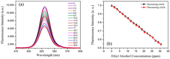 The evolution of the fluorescence spectra of QDs using different ethanol vapor concentrations is presented in Figure 5a. As the alcohol vapor concentration increased, more ethanol vapor molecules diffused into the QD gel, causing the decrease in the refractive index of the QD gel, and finally the fluorescence intensity reduced. To analyze the relationship between the fluorescence intensity and the ethanol vapor concentration, the peak fluorescence intensity at ~530 nm was recorded and normalized. Figure 5b gives the experimental data and linear fitting results. For both the ascending and descending tests, the sensor showed good linear response and the hysteresis was very low. The ethanol sensitivity was calculated as −3.3%/ppm, which is three orders higher than the previous work, which was based on wavelength demodulation methods with a relative sensitivity of 6−5%/ppm [6]. It should be noted that the sensitivity can be further enhanced by decreasing the diameter of the microfiber, exploring an optimal QD doping concentration, and fabricating fiber grating pairs on both sides of the microfiber to form a resonant cavity.