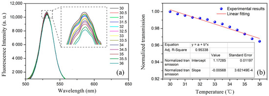 Since the temperature cross-sensitivity always affects sensing performance, the temperature response of the sensor was also explored. The sensor was put into an oven and the temperature was increased from 30 °C to 36 °C by a step of 0.5 °C. The spectrum was recorded at each temperature when it became stable. Figure 6a presents the evolution of the QDs’ fluorescence spectra under different temperatures. As the temperature increased, the fluorescence intensity decreased slightly. The normalized fluorescence intensity as a function of temperature is also given in Figure 6b. By linear fitting, the temperature sensitivity of the sensor was obtained as −0.57%/°C, which leads to a cross-sensitivity of approximately 0.17 ppm/°C. Compared with previous studies [4,5,6], the temperature cross-sensitivity is extremely low. However, for high-precision measurements, temperature controlling should be considered during real applications.