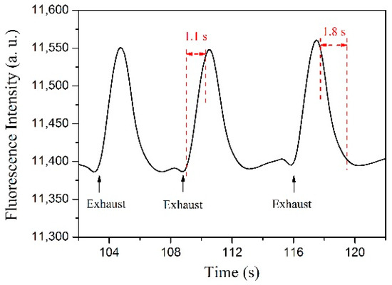 Response time is an important property of a sensor. The response time of the reported optical fiber sensors with a similar structure can be tens of seconds to several minutes [4,5,6,7,8,9,10,18]. We measured the response time of the fabricated sensor by real-time recording the QD peak fluorescence intensity at 530 nm when periodically exhausting the ethanol vapor out of the culture dish. The detailed testing process was as follows: a drop of ethanol was injected into the culture dish. Before it totally evaporated, periodical exhausting was conducted. The test results are shown in Figure 7 and one can see that after the exhaustion, due to the sudden decrease in the concentration of the ethanol vapor, the fluorescence intensity increased rapidly. After each exhausting, the dish was sealed again, thus the ethanol continued evaporating and the concentration of the ethanol vapor increased again, causing the fluorescence intensity to decrease. When the intensity reached the original level, the next exhaustion was conducted. From the experimental results, the response and recovery times were calculated at approximately 1.1 s and 1.8 s, respectively, which represents the time the sensor takes to reach 95% and 15% of its final and original value, respectively.
