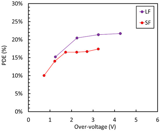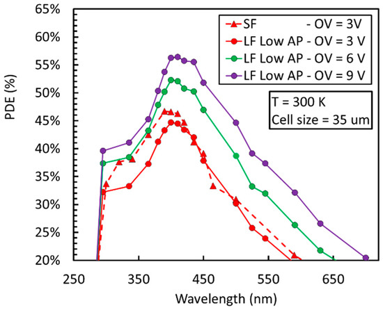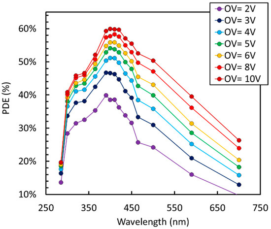 PDE vs. wavelength measured with the largest cell size is reported in Figure 3, for different values of the overvoltage (OV), i.e., the bias voltage above the breakdown voltage, VBD.