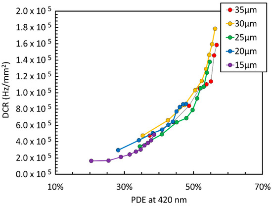 Dark count rate (DCR) as a function of the PDE at 420 nm for the different cell sizes of the NUV-HD SiPMs (from 15 µm to 35 µm).