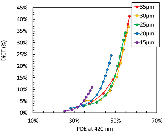Direct optical Crosstalk (DiCT) as a function of PDE for the different cell sizes of the NUV-HD SiPMs (from 15 µm to 35 µm).