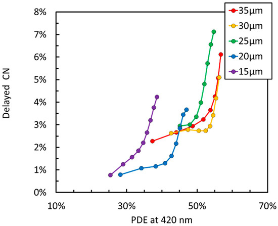 Another important noise source in SiPMs is correlated noise, constituting of optical crosstalk and afterpulsing. Figure 6 shows a plot of direct optical crosstalk (DiCT) vs. PDE at 420 nm for different NUV-HD cell sizes. DiCT is defined as in Reference [18].